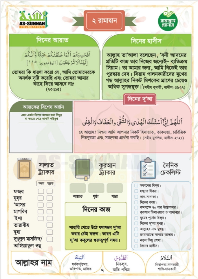 আপনার ইবাদতকে সুশৃঙ্খল করতে এতে আরও যুক্ত করা হয়েছে সালাত ট্র্যাকার, কুরআন ট্র্যাকার এবং দৈনিক চেকলিস্ট। এই মূল্যবান জ্ঞান ও আমলসমূহ কেবল রমাদানেই সীমাবদ্ধ থাকবে না, বরং তা আপনার সারাজীবনের পাথেয় হয়ে উঠবে ইনশাআল্লাহ।