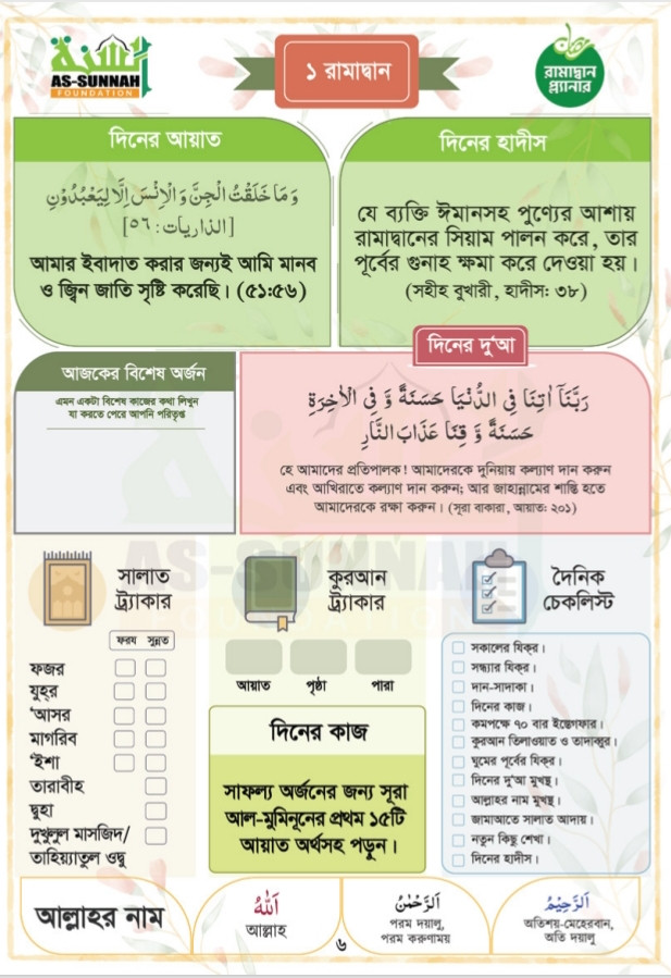 এই বাস্তবতা বিবেচনায় নিয়ে রমাদানকে তাকওয়া অর্জনের মাধ্যমে সার্থক করা, আমল দিয়ে সাজানো এবং জান্নাতের পথে আরও এক ধাপ এগিয়ে যাওয়ার লক্ষ্যে আমরা উপহার দিচ্ছি ‘রমাদান প্ল্যানার’।